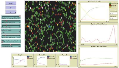 Firstly, agents experience the process of information exchange and fear formation. In this stage, the levels of fear of vaccines and fear of disease are related to the risk information they receive from hubs and their friends by interacting with them. Then, based on the HUMAT framework, actions on whether to vaccinate could only be taken after comprehensive consideration of the satisfaction of three needs: experiential need, social need and value. Lastly, confirmation bias is considered, that is, whether or not the agent is ultimately vaccinated, they will try to find more information to confirm their decision to reduce cognitive dissonance in various ways, such as signalling and persuading others, and alter ego networks.
