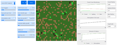 Implemented features include: - Forest patches with dynamic soil quality, moisture, drought stress, and carbon stock - Two logger behaviors (responsible vs. irresponsible) - Endogenous carbon cycle with atmospheric CO₂ tracking - Climate warming feedback mechanism - Economic profit tracking for logging agents - Adjustable parameters via user interface controls
