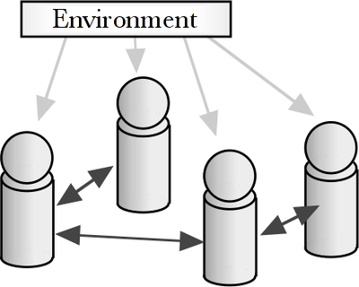 Agents are subject to stimuli with probability p, then interact with other agents with probability q, and then move to another community with probability r. Levels of political participation are updated at the end of each round, assumed to be 1 week. The values of p, q, and r are determined by the political environment (put differently, the political environment is determined by p, q, and r). Agents keep a history of their level of political participation.
