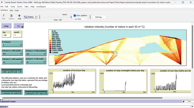 In the model interface, several critical outcomes of the ABM will be presented, including the visitor density map, total number of visitors per day, and number of visitors per type (local, stay overnight, and one-day visitor). Users will have the option to explore the impact of various changes on these outcomes, such as: 1. Landscape layout information, including the number of entrances and their accessibility to car parking. 2. Information about the number and types of visitors, including: - The visitors-growth-index, which ranges from 1 to 1.2. A value of 1 indicates no change, while 1.2 indicates a 20% increase in visitors. - Indexes representing visitors per activity per type (e.g., n-swimmer-loc-indx), which can vary from 0 to 0.2. A value of 0 indicates no change, while 0.2 represents a 20% increase. The model requires specific inputs, which are provided in the same folder as the model file. When you download and use the model, please be sure to update the directory in the code within the setup section (set-current-directory) to reflect the directory where you saved the model. The model requires specific inputs, such as weather conditions (temperature, precipitation, rainfall duration, wind speed), provided for 365 days. If the model is run for more than 365 days, data for additional days should also be supplied. Considering the maximum number of visitors is crucial, as the model is highly sensitive to this parameter. Exceeding a certain threshold can lead to significant computational load, potentially causing performance issues. Any adjustments or changes should be made while keeping this sensitivity in mind. If you plan to use the model for your specific case study, certain sections of the code need to be updated with relevant information. These sections are clearly identified in the code for ease of customization.