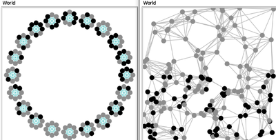 Both models simulate n-person prisoner dilemma in groups (left figure) where agents decide to C/D – using a stochastic threshold algorithm with reinforcement learning components. We model fixed (single group ABM) and dynamic groups (bad-barrels ABM). The purpose of the bad-barrels model is to assess the impact of information during meritocratic matching. In the bad-barrels model, we incorporated a multidimensional structure in which agents are also embedded in a social network (2-person PD). We modeled a random and homophilous network via a random spatial graph algorithm (right figure).
